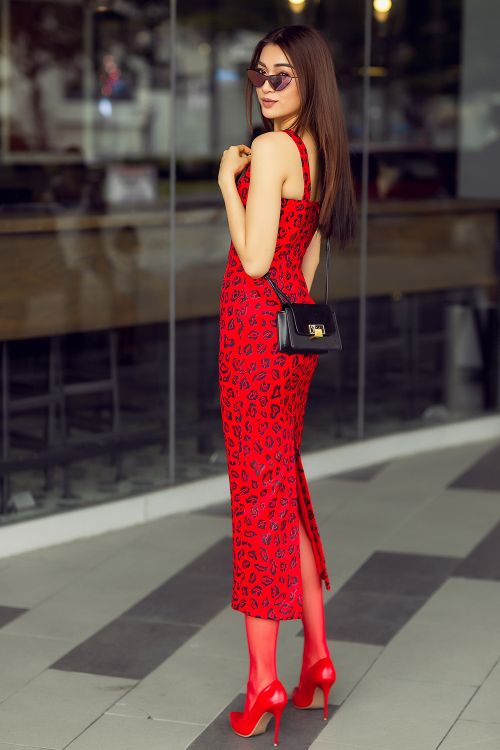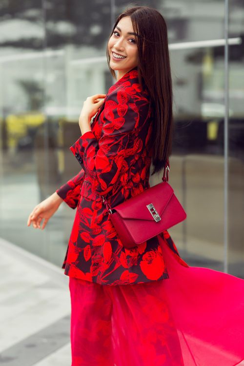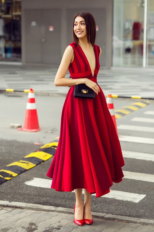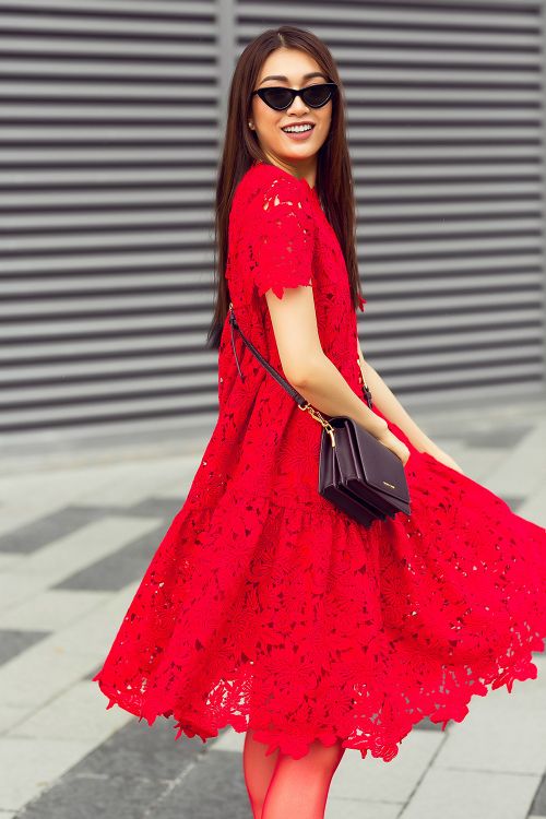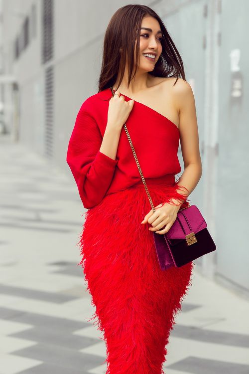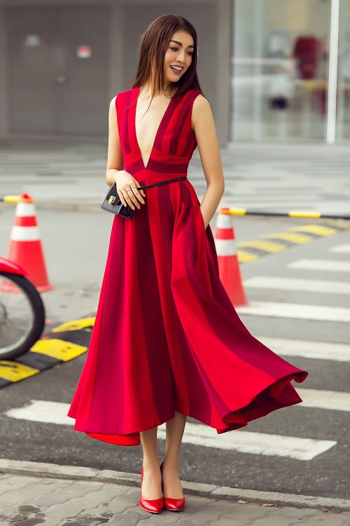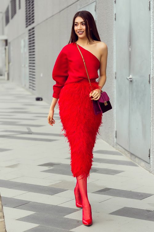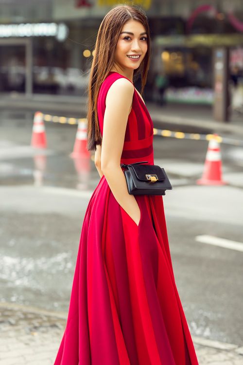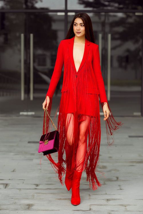 Người đẹp mang đến màu sắc mới cho thiết kế khi phối cùng túi đeo chéo của Furla, giày cao kết hợp cùng tất da đồng điệu sắc đỏ. Đây là một trong những thiết kế bán chạy nhất những năm qua của Đỗ Mạnh Cường bởi tính đơn giản, sang trọng, hợp mốt