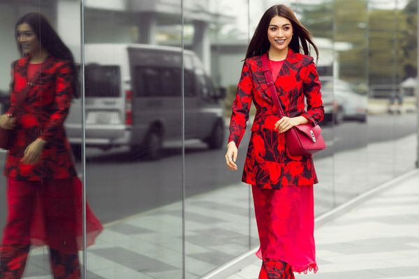 Họa tiết hoa to bản được sử dụng kỹ thuật in mang đến những hình khối, mảng màu có chiều sâu ấn tượng. Bộ trang phục mang nét thanh lịch nhưng không kém phần nổi loạn, cá tính.