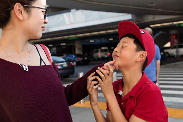 Bảo Nam tỏ ra ngại ngùng khi được mẹ hôn má.