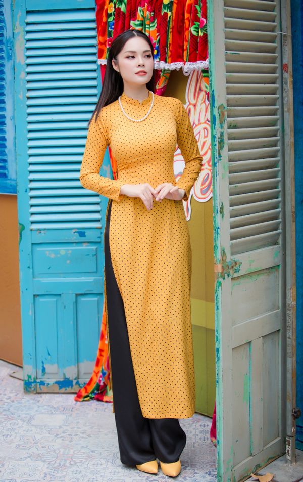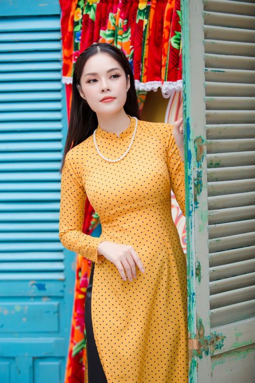 Nàng Á hậu Điện ảnh vẫn chọn Áo dài truyền thống với phom dáng cổ điển, chất liệu đơn giản cùng hoa văn nhẹ nhàng.