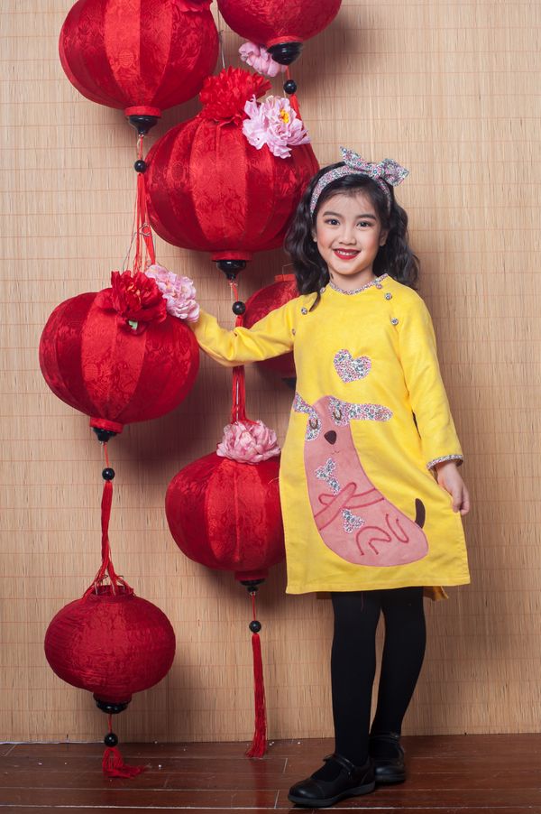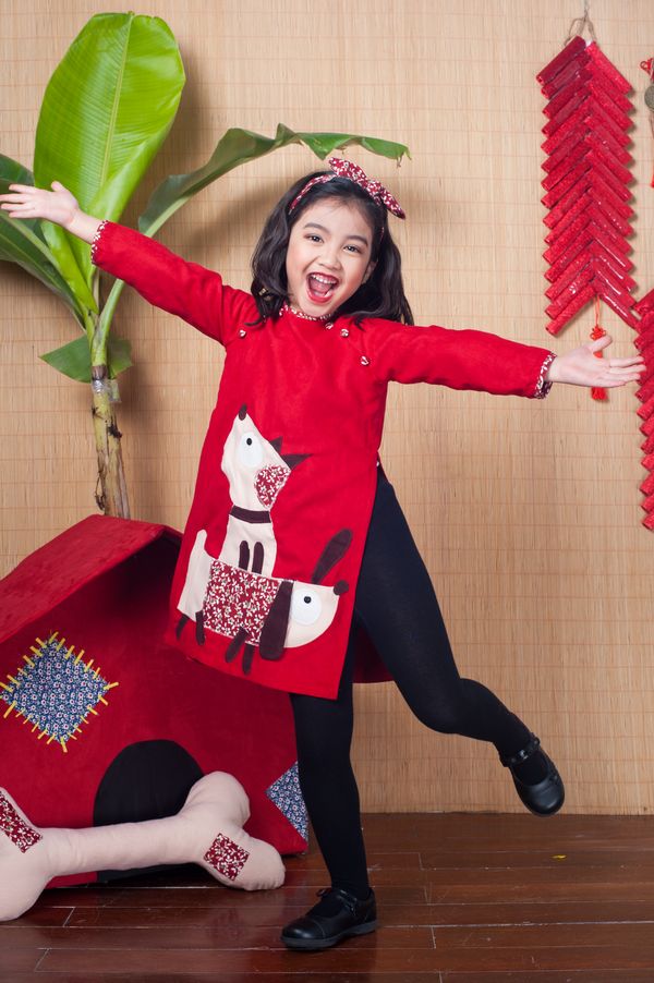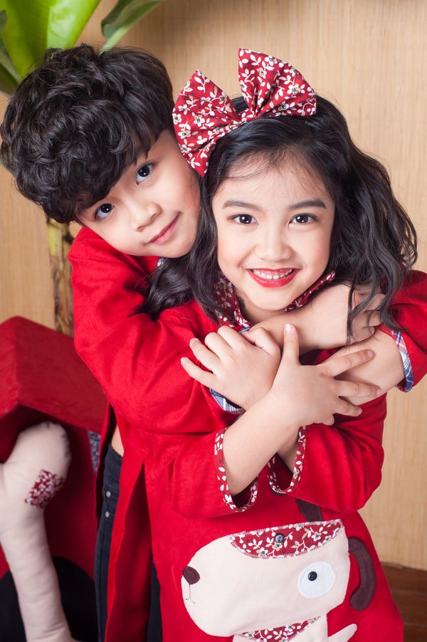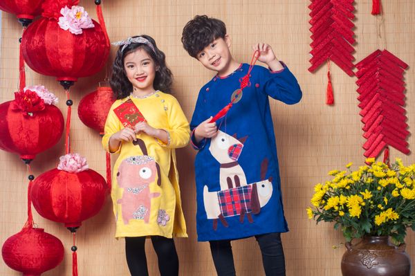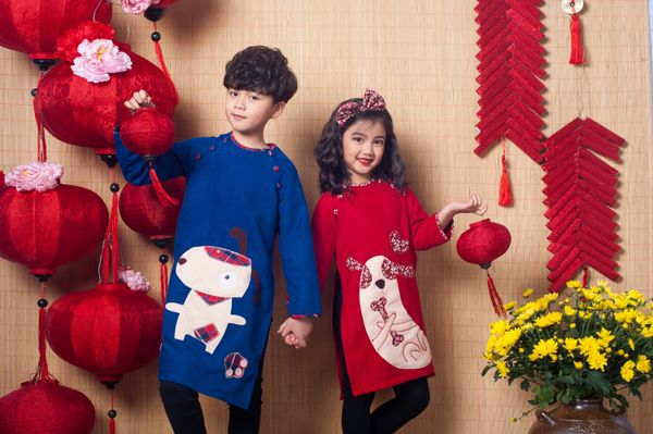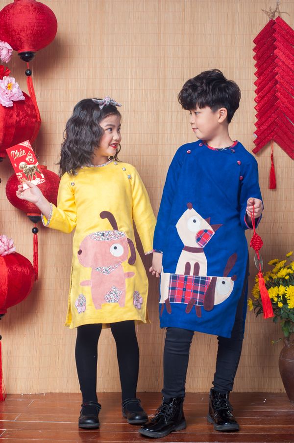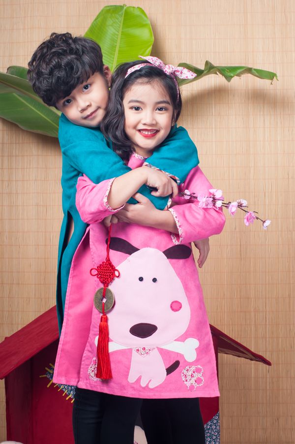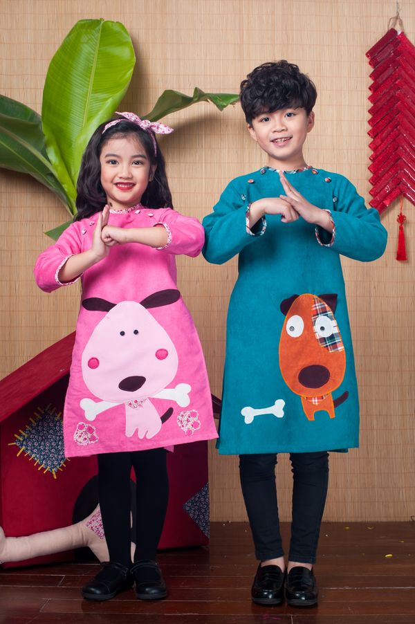 Cặp đôi siêu mẫu nhí nổi danh Hà thành vừa thực hiện những hình ảnh đẹp tựa trong tranh với chủ đề mừng xuân Mậu Tuất 2018. Trang phục lần này của các bé là những chiếc áo dài nằm trong BST “Tết Con cún” với thiết kế khá độc đáo của Ó Boutique. Điểm đặc biệt của chúng là vạt áo được thêu những chú cún ngộ nghĩnh.