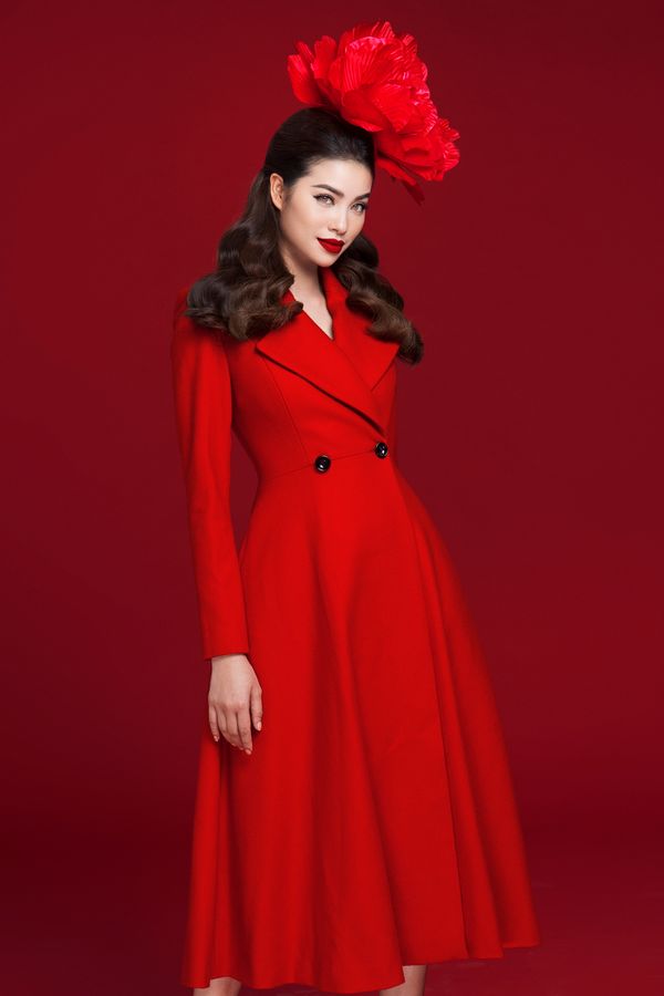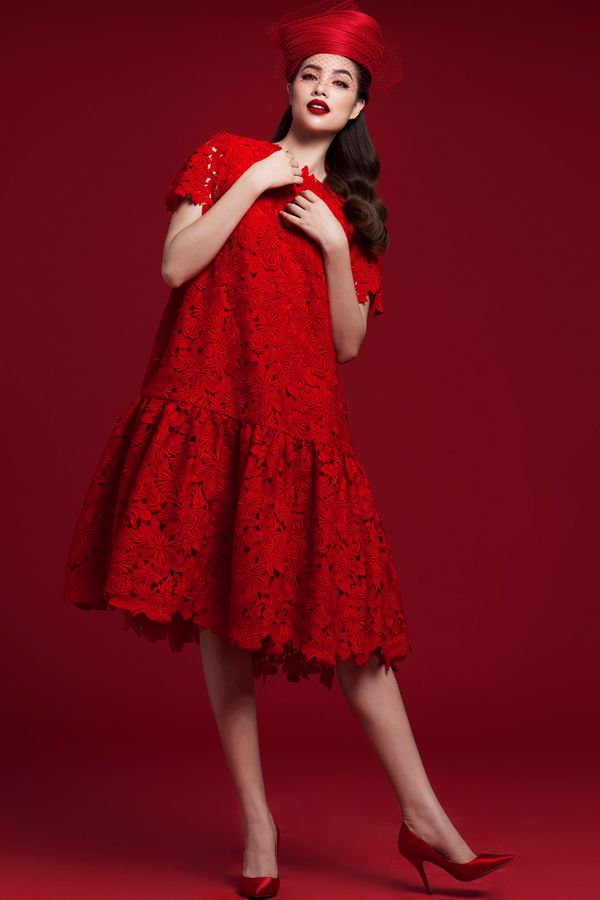 Phạm Hương toát lên nét thanh lịch nhưng không kém phần nổi bật với sắc đỏ. Hình ảnh quý cô châu Âu cổ điển được Hoa hậu Hoàn vũ Việt Nam 2015 thể hiện qua phom shirt dress hiện đại.