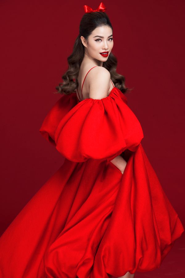 Sắc đỏ rượu nồng nàn của phom váy cocktail với hoạ tiết nơ to bản được Phạm Hương kết hợp đồng điệu màu sắc cùng giày cao mũi nhọn.