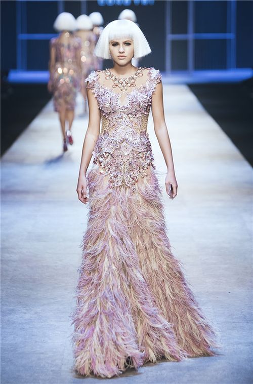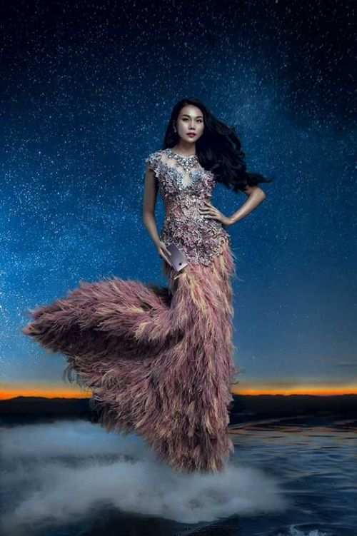 Trước đó, siêu mẫu Thanh Hằng đã từng diện chiếc váy đính lông vũ lộng lẫy này trong một bức ảnh chụp quảng cáo. Nếu so với nét dịu dàng, nữ tính của Khánh My thì Thanh Hằng lại ghi điểm với hình tượng sắc sảo, quyền lực, đúng với ý đồ NTK.