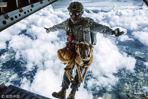 Vẻ mặt đầy “ái ngại” của chú chó khi phải cùng người đồng đội nhảy từ độ cao hơn 4.000 mét để tham gia tìm kiếm cứu nạn. Được biết cho chó có tên là Siara, mới được một tuổi.
