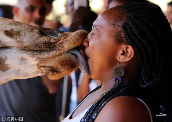 Chú hươu cao cổ tại Nairobi, Kenya, dường như muốn nói: “Đừng có khiếp sợ như vậy, em chỉ đang muốn hôn chị thôi mà”.