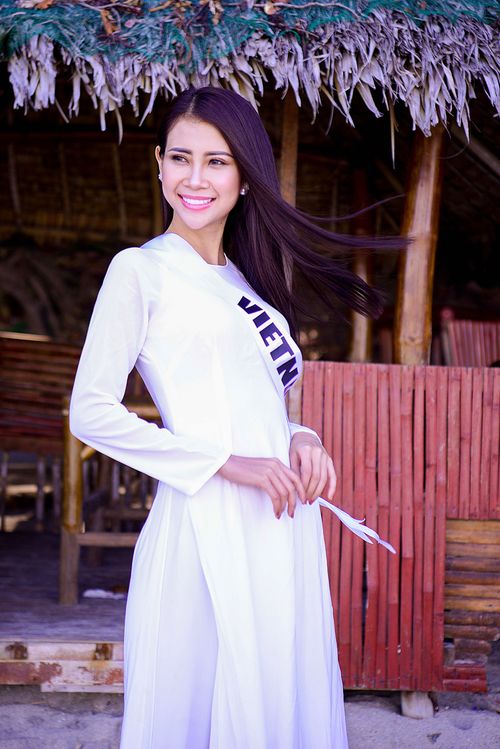 Diện tà áo dài trắng đơn giản, Liên Phương khiến người đối diện không thể rời mắt với nét thanh tao, nhẹ nhàng. Trước đó, top 3 Hoa khôi du lịch Việt Nam 2017 đã dành nhiều thời gian rèn luyện các kĩ năng cần thiết như catwalk, trang điểm nhằm đạt được thứ hạng cao trên đấu trường nhan sắc quốc tế.