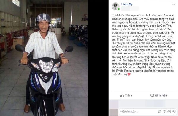 Mới đây, trên trang cá nhân, Diễm My tiếp tục khiến fan cảm động khi chia sẻ đã mua tặng chú Mười Hên - “người hùng” cứu 11 người trong sự cố sập cầu Cần Thơ năm 2007 một chiếc xe máy. Món quà không quá “vĩ đại”, nhưng có giá trị không nhỏ đối với cuộc sống đời thường của chú Mười Hên khi cả gia đình không có phương tiện đi lại.