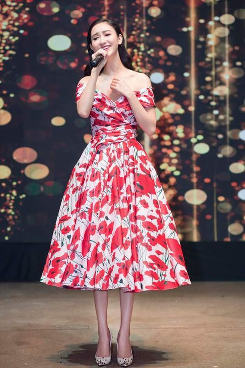 Chi tiết trễ vai cùng họa tiết nổi bật giúp tôn lên làn da trắng sứ của người đẹp gốc Huế. Thật không ngoa khi nói rằng, Hà Thu đẹp như một nàng công chúa trong chiếc váy này.