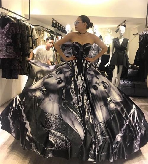 Diện chiếc váy này cô phải cần có 4 trợ lý đi cùng để giúp đỡ trong quá trình di chuyển, quay người chụp ảnh. Được biết, thiết kế đình đám này đã từng được người mẫu Thuỳ Trang trình diễn đẹp mắt trên sàn catwalk.