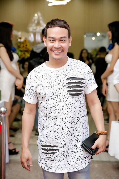 Minh Dũng lựa chọn áo thun rách khá cá tính khi đến chúc mừng đàn em lên chức bà chủ.