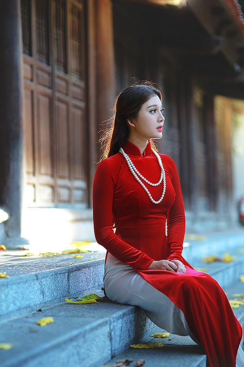 Nếu thích vẻ cổ điển, áo dài đỏ được làm từ chất liệu nhung sẽ là lựa chọn tuyệt vời cho nàng. Đối với lọai áo dài này, chỉ cần nhấn nhá thêm vòng cổ hay hoa tai là đã đủ xinh hết phần thiên hạ.
