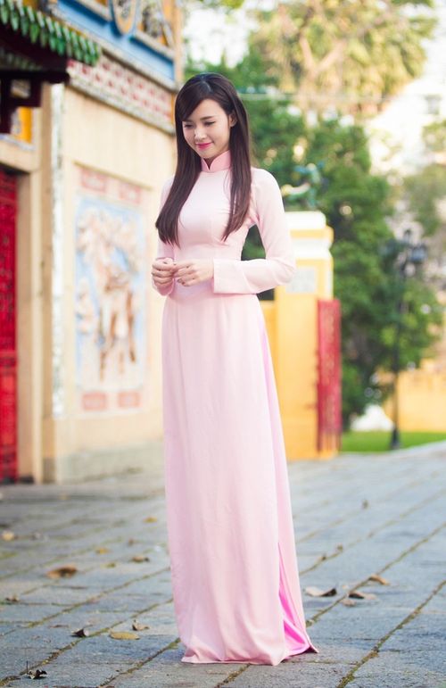 Nếu cảm thấy sắc đỏ hơi rực rỡ quá thì tà áo dài màu hồng sẽ là lựa chọn tuyệt vời. Khoác lên người chiếc áo dài màu hồng phớt thì đúng chuẩn “em đẹp rạng ngời mà không chói lóa”!