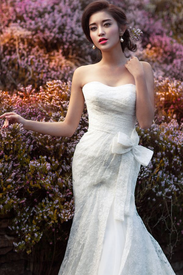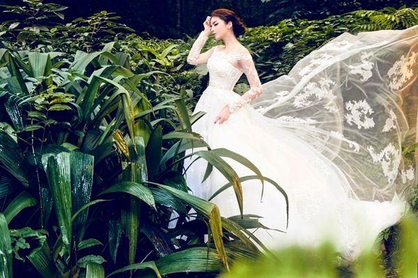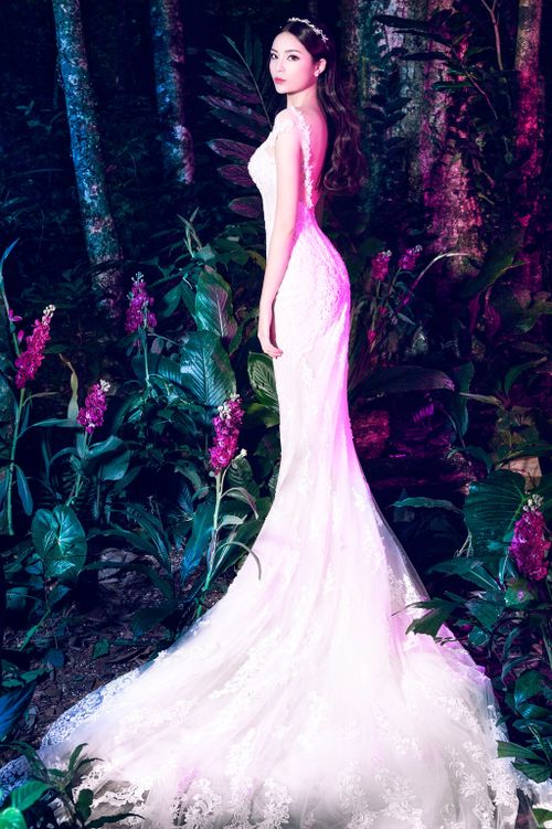 Với mẫu váy cô dâu tùng xòe rộng, trễ vai cùng thần thái mơ màng. Kiểu tóc búi ca đánh rối, hoa hậu Việt Nam 2014 trông như một nàng công chúa xinh đẹp giữa khu rừng.