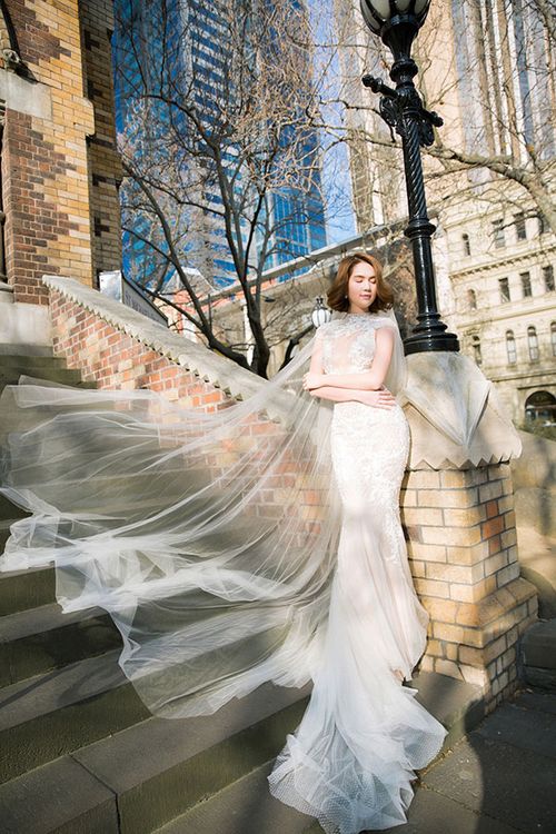 Thiết kế váy cưới với kiểu dáng cách điệu từ trang phục nội y chất liệu ren xuyên thấu kết hợp cùng băng-đô và khăn voan mang lại vẻ ma mị và quyến rũ khó cưỡng cho Hoa khôi áo dài Việt Nam.