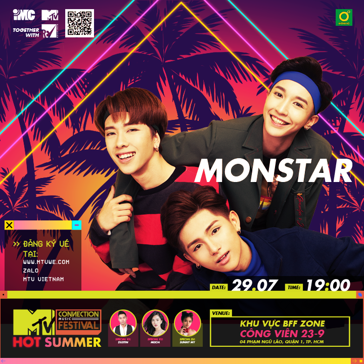 Vào lúc 19h00 ngày 29/7 sắp tới, Monstar sẽ xuất hiện trong chương trình "MTV Connection Tháng 7: Hot Summer" tại khu vực BFF Zone công viên 23/9. Tại đây, các chàng trai sẽ thể hiện những bản hit sôi động của mình dành tặng khán giả.