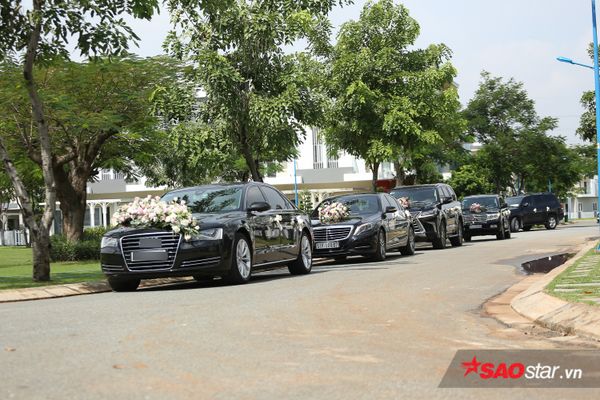 Đúng 10h, dàn xe hơi chở chú rể Trung Tín cùng đại diện nhà trai đã có mặt tại nhà riêng của hoa hậu Đặng Thu Thảo và chuẩn bị làm lễ rước dâu. Nụ cười rạng rỡ hiện hữu trên gương mặt của chàng doanh nhân trẻ.