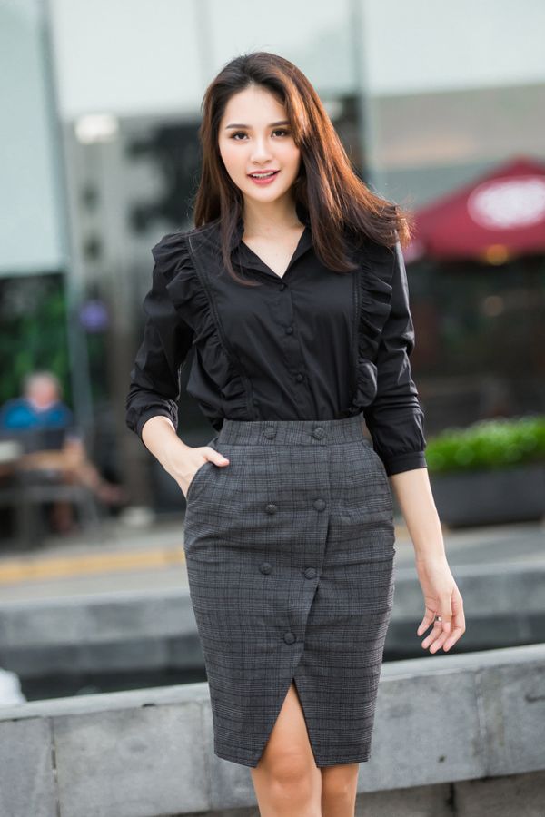 Với đôi chân dài miên man, người mẫu luôn biết cách khoe sự gợi cảm của mình dù trang phục khá kín đáo