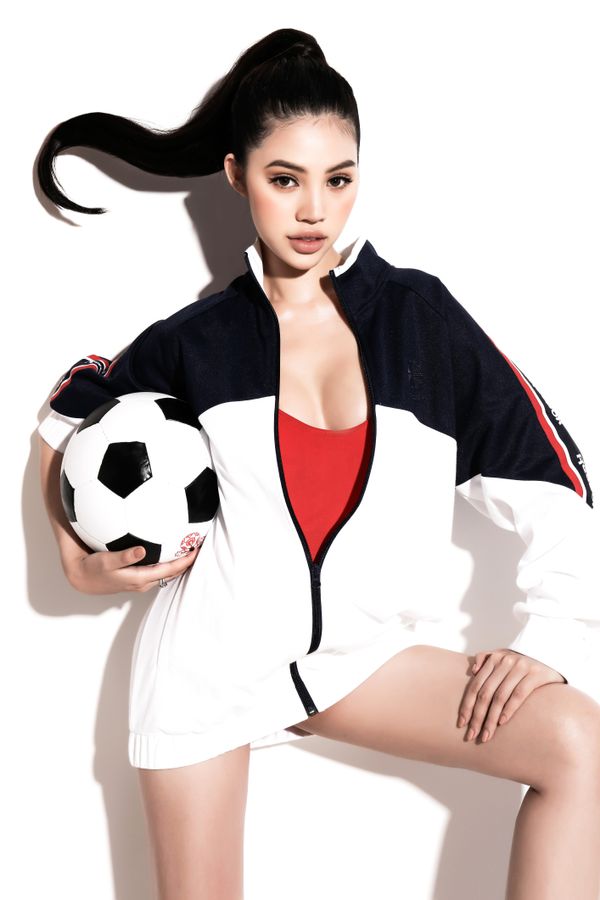 Ngoài bộ ảnh, trước đó hoa hậu Jolie Nguyễn cũng đã thể hiện tình cảm dành cho đội tuyển U23 Việt Nam bằng cách chia sẻ các bài báo, các hình ảnh của U23 Việt Nam cũng như cổ vũ vô cùng nồng cháy khi xem trực tiếp cá trận đấu qua màn hình tivi. Photo: Nguyễn Du, Stylist: Mạch Huy, Makeup: Hoàng Hiển, Hair: Sơn Lê.