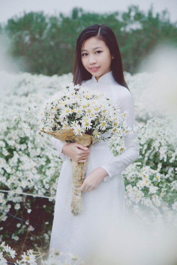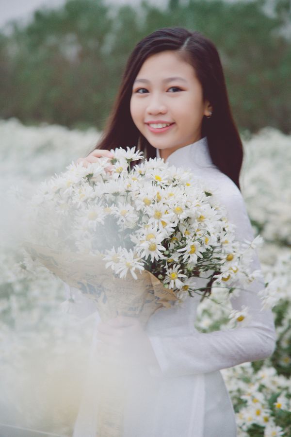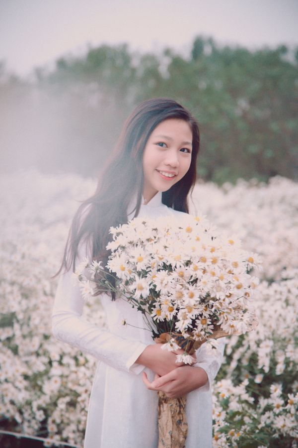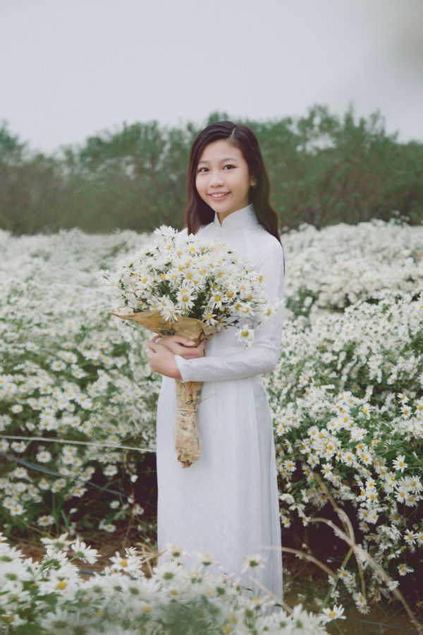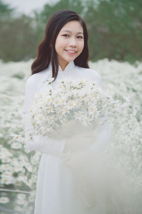 Giữa vườn cúc họa mi cũng ngập tràn sắc trắng, Ngọc Lan Vy nổi bật với nụ cười rạng rỡ.