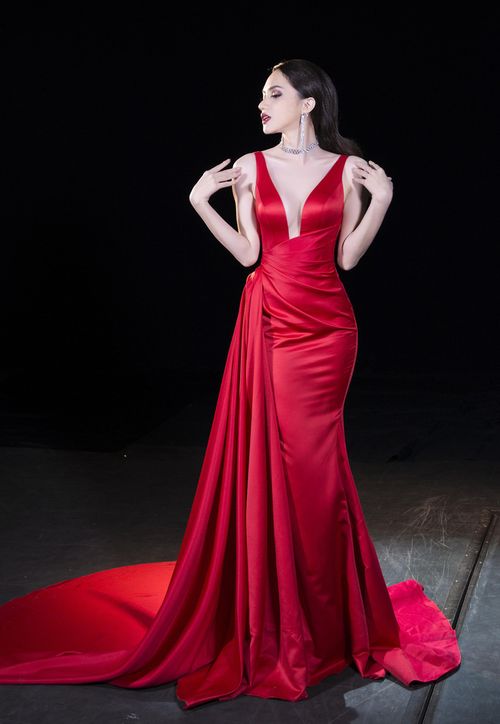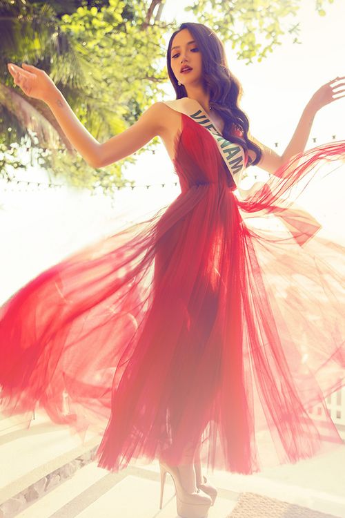Trước đó, khi tham gia hoạt động bên lề cuộc thi vào ngày 6/3 Hương Giang cũng khiến người đối diện không thể rời mắt khi lựa chọn chiếc váy xòe bằng vải voan đỏ của NTK Đỗ Mạnh Cường. Cách xử lí tinh tế khiến chiếc váy có được những mảng miếng dày, mỏng khác nhau, làm nên vẻ đẹp quyến rũ cho người mặc.