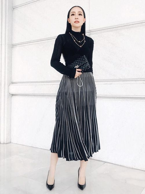 “Chim công làng múa” - Linh Nga lại gợi ý cách diện tông đen sang trọng mà không hề già dặn. Chân váy xếp li đi cùng áo ren cổ lọ, điểm xuyết dây chuyền tinh tế là cách mà Linh Nga hút hồn người đối diện.