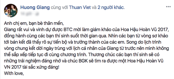 Song do lịch trình vòng chung kết dời ngày trùng với lịch cá nhân của Giang từ trước nên mình không thể sắp xếp tiếp tục đi cùng chương trình. Thương chúc các bạn thí sinh có những trải nghiệm đáng nhớ và chúc BGK sẽ tìm ra được một Hoa Hậu Hoàn vũ Việt Nam 2017 tài sắc xứng đáng!”