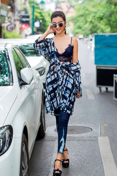 Tuy nhiên, như bộ này thì có phần hơi quá. Áo trễ hẳn một bên vai hờ hững tuột lúc nào không hay. Chưa kể áo ren kết hợp với áo choàng họa tiết kẻ ô còn khiến cho bộ đồ rối rắm vô cùng.