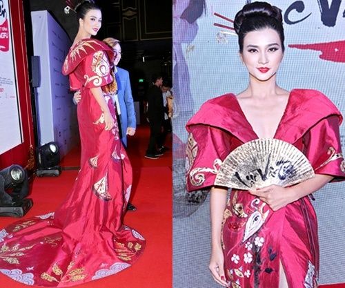 Chiếc váy này là một lần hiếm hoi Kim Tuyến diện đồ phù hợp với sắc vóc của mình. Tuy tôn được vóc dáng mảnh mai của bà mẹ một con, nhưng nhìn cô nàng nhiều người liên tưởng đến một chiếc bình gốm sứ khổng lồ.