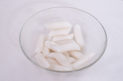 - Bạn cho bánh gạo vào nước nóng ngâm 5 phút rồi vớt ra.