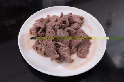 - Cho thịt bò vào ướp với xì dầu, đường, rượu gạo và dầu mè trong 15 phút.