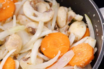 - Tiếp tục cho dầu vào chảo đun nóng, phi thơm tỏi rồi cho hành tây, cà rốt, nấm vào xào qua. Các bạn có thể nêm thêm một chút muối nhưng đừng cho quá nhiều nhé.