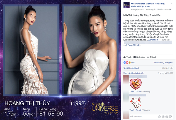 Hình ảnh và thông tin của Hoàng Thùy được đăng tải trên fanpage chính thức của cuộc thi Miss Universe Vietnam - Hoa Hậu Hoàn vũ Việt Nam.