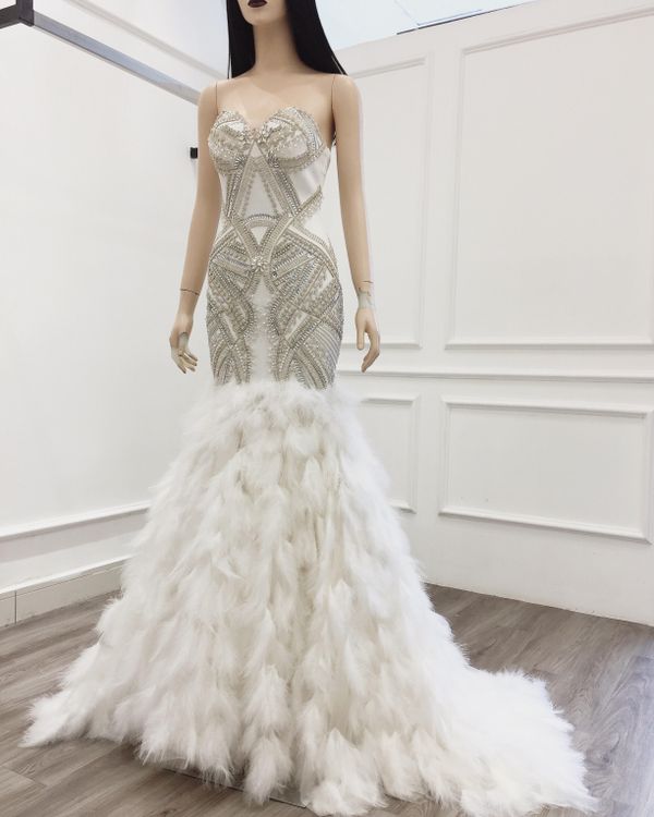 Cận cảnh bộ váy đuôi cá lộng lẫy mà Erika Tsuji sẽ mặc vào đêm chung kết 25/10 tới đây. Được đính kết tính tế bằng pha lê và lông vũ, Lê Ngọc Lâm chia sẻ, chiếc váy được làm gấp trong vòng 3 ngày với sự trợ giúp của 5 người thợ. Toàn bộ chi tiết được làm tỉ mỉ, kỹ thuật đính kết các loại đá cao cấp tạo ra các họa tiết hình học làm tăng hiệu ứng thị giác.
