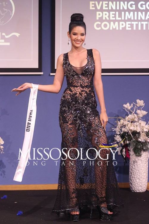 Đại diện Thái Lan khoe sắc trong bộ đầm xuyên thấu đen vô cùng gợi cảm. Chất liệu voan mỏng tạo vẻ đẹp nhẹ nhàng trong thiết kế trên.