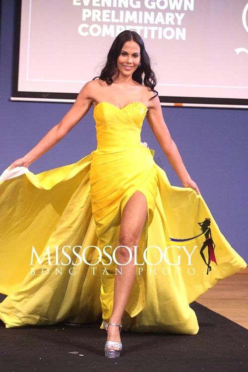 Philippines khoe vẻ đẹp vừa phải với bộ đầm tông vàng ấn tượng. Trong phần thi của mình cô có phần xử lí tà váy khá thông minh, linh hoạt tạo sự cộng hưởng cho bộ đầm cô đang mặc.