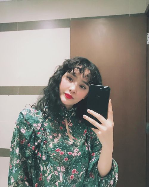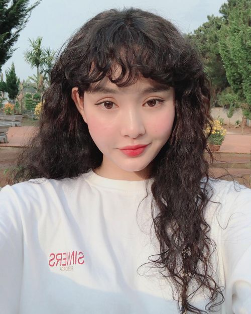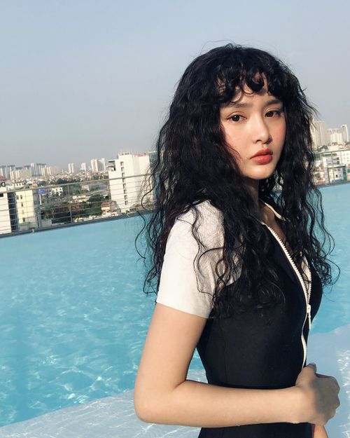 Thỉnh thoảng Hiền Hồ cũng không ngại “khoe trán” với kiểu tóc uốn xoăn nhẹ với phần mái rẽ lệnh thế này.