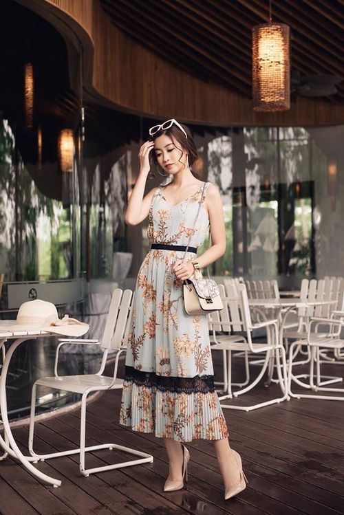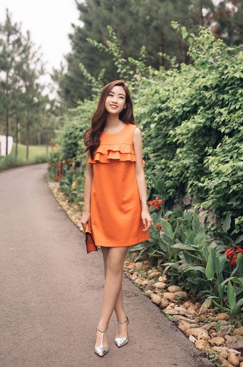 Những phom dáng đầm như thế này phù hợp với vóc dáng và gương mặt thanh tú của Hoa hậu. Điểm nhấn thời thượng trên tổng thể set đồ còn đến từ chất liệu trơn, đơn sắc tôn thêm sự nhẹ nhàng khi dạo phố.