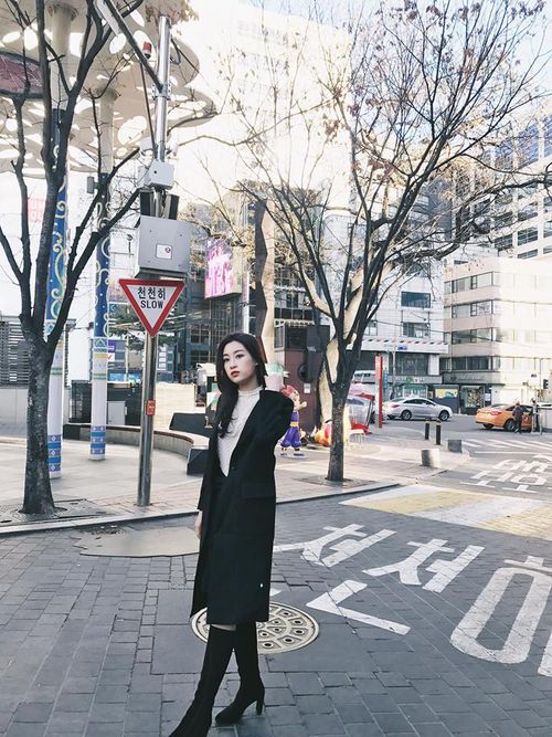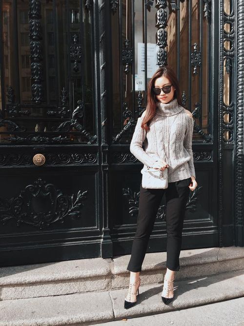 Có thể thấy cô nàng không chạy theo xu hướng hàng hiệu như các hoa hậu khác. Thay vào đó cô chỉ có vài ba món đồ đắt giá được cô tận dụng nhiều lần. Song vẫn thu hút nhờ cách phối đồ hài hòa đẹp mắt. Hoa Hậu chọn mặc cùng áo khoác lửng, mix với quần đen ton-sur-ton và áo phông trắng.