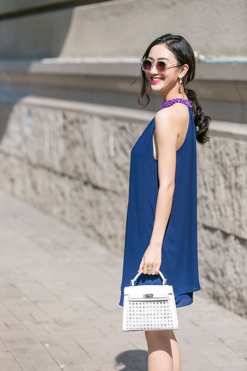 Với chiếc đầm suông chất liệu voan không họa tiết, cùng phụ kiện đơn giản là kính mát nâu trầm, túi cầm tay đính đá, Hà Thu làm nên một phong cách vô cùng thanh lịch, thuần khiết cho riêng mình.