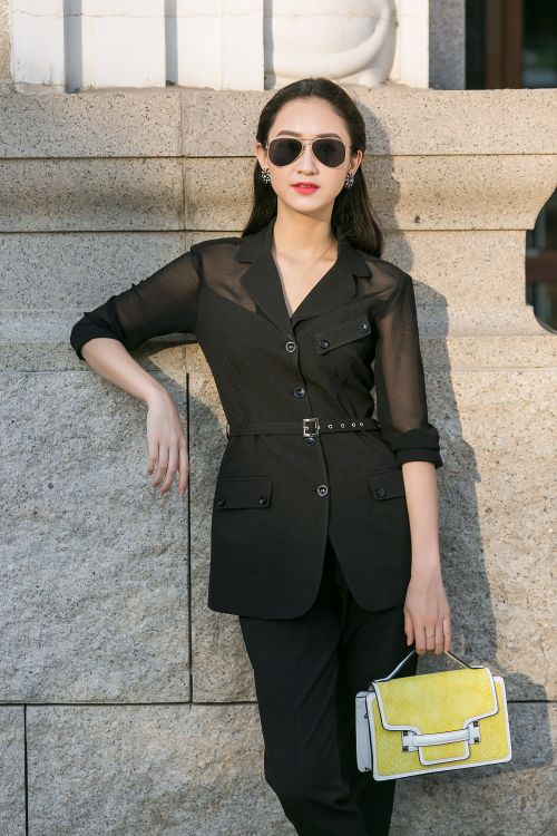 Nếu sắc tím làm tăng nét mong manh gây thương nhớ thì sắc đen mang đến một nét đẹp thật bí ẩn ở á hậu. Diện cả cây vest đen cùng phụ kiện là chiếc túi xách vàng tươi khiến Hà Thu vô cùng nổi bật, cặp kính đen khiến cô nàng trông thật “ngầu”.