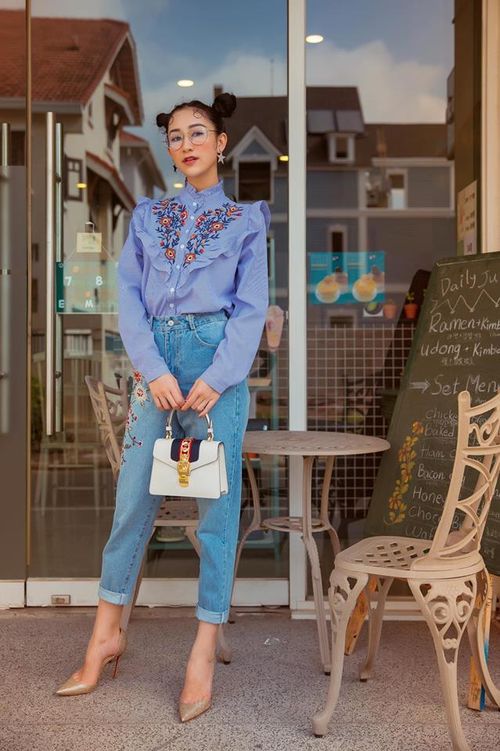 Set sơ mi cổ trụ thêu hoa + baggy jeans cùng giày cao gót cũng rất trẻ trung mà không hề “bánh bèo”.