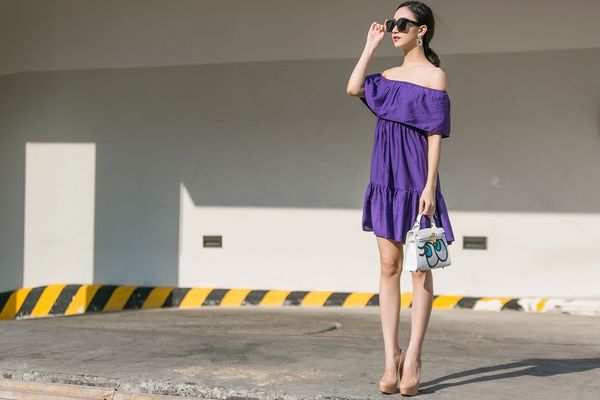 Drop waist dress trễ vai với gam tím mộng mơ làm nét đẹp mong manh của người đẹp xứ Huế bộc lộ rõ hơn bao giờ hết.