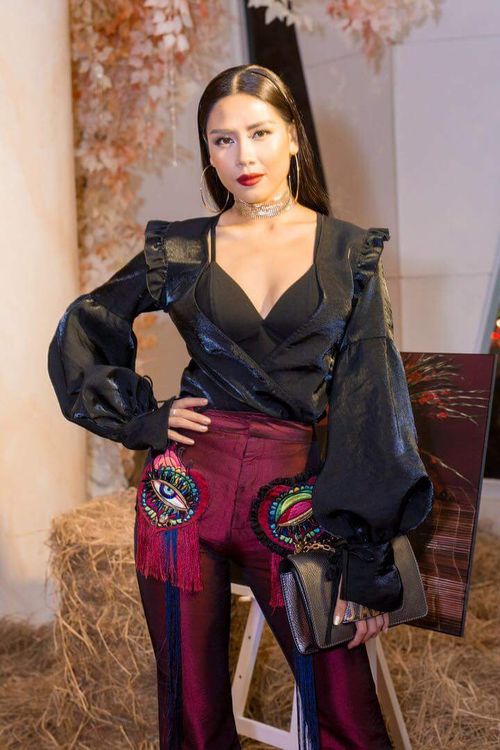 Bộ trang phục được thiết kế cầu kỳ, mang tông màu đỏ đen nổi bật, chất liệu taffta kèm lụa sống tạo bề mặt bóng nhẹ. Đặc biệt, chi tiết thêu đính hình đôi mắt tỉ mỉ kèm tua rua là điểm đặc biệt tạo nên sự ấn tượng cho cả outfit. Tuy nhiên, bộ cánh hơi hướng truyền thống được phối cùng tông trang điểm và kiểu tóc hiện đại lại không ăn nhập. Thậm chí, mái tóc Natra và lối trang điểm trẻ trung đã làm giảm giá trị truyền thống mà nhà tạo mốt muốn gửi gắm vào thiết kế.