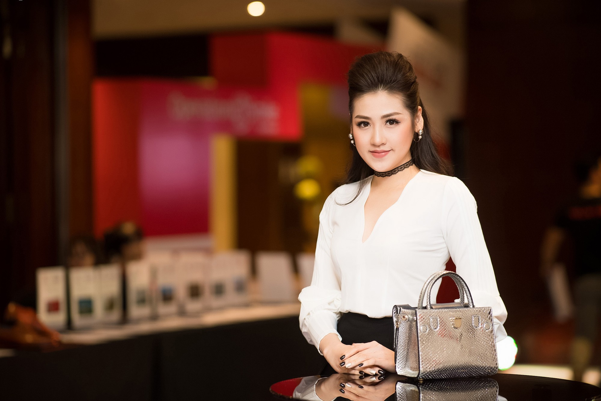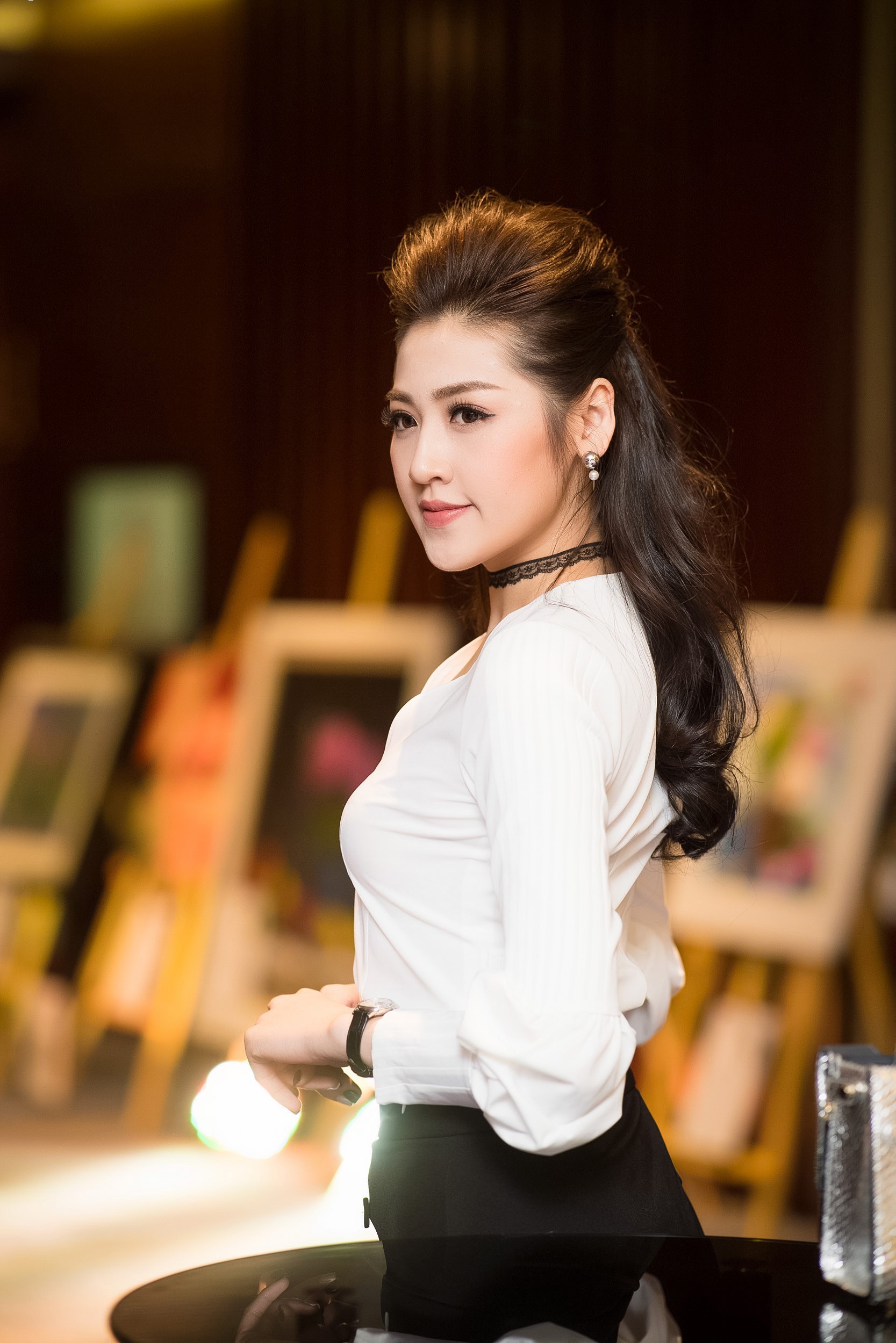 Tại sự kiện, Tú Anh lựa chọn trang phục thanh lịch nhưng vẫn toát ra vẻ gợi cảm: Chiếc áo trắng không cổ được kết hợp với chân váy màu đen xẻ cao khoe khéo đôi chân dài quyến rũ.