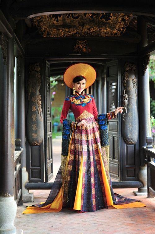 Trang phục này được thiết kế bởi NTK Thuận Việt. Màu sắc chủ đạo là màu vàng đồng và đỏ sẫm của chất liệu lụa truyền thống Việt Nam. Sự tinh tế của bộ trang phục được thể hiện qua ép nhũ vàng và thêu tay các họa tiết một cách tỉ mỉ và kỳ công.