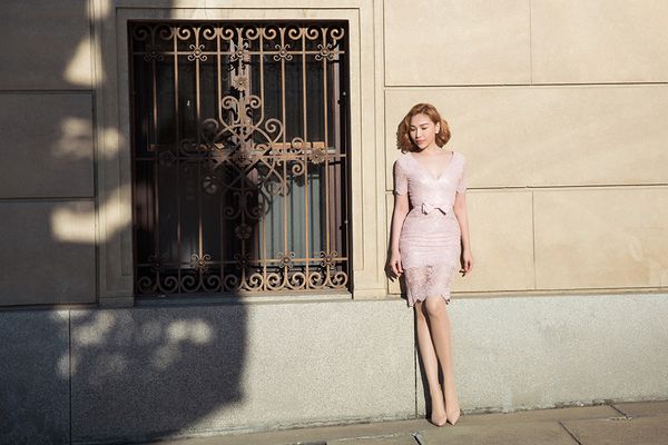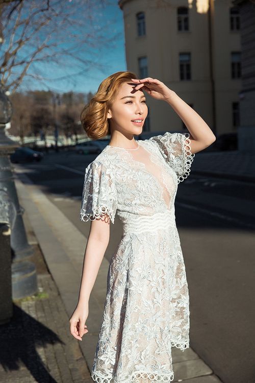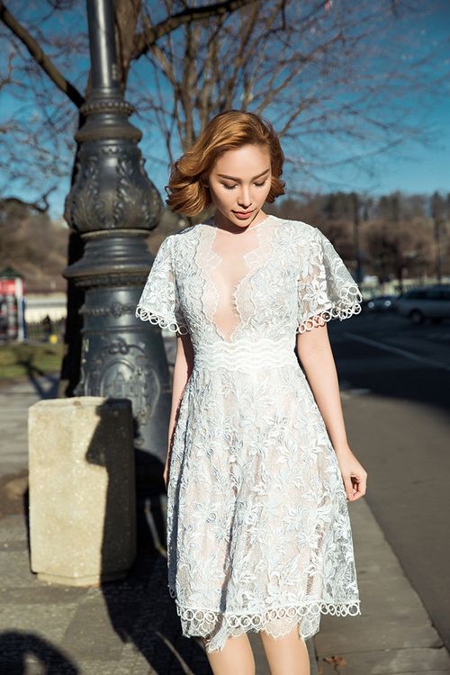 Chi tiết ren lông mi được phối dưới tùng váy cũng góp phần tạo nên nét nữ tính, lựa chọn đôi cao gót màu nude, Quỳnh Thư trông thật nền nã, tự nhiên.