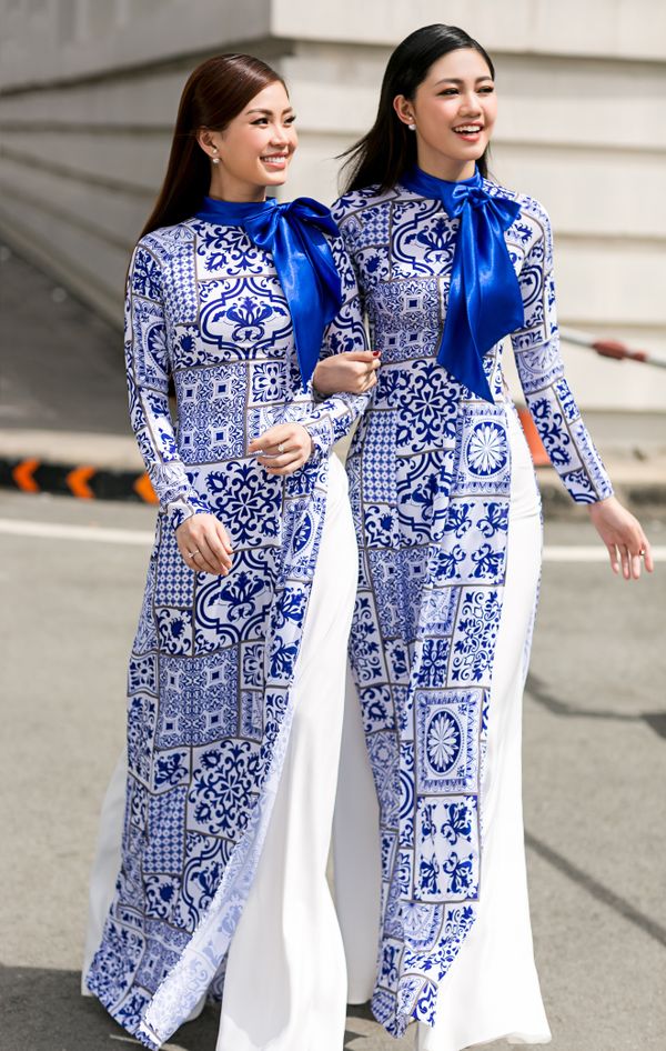 Với áo dài họa tiết gạch tông màu xanh trắng, cả 2 nàng á hậu cùng lựa chọn chiếc khăn màu xanh duyên dáng hợp tông. Phom dáng ôm sát của chiếc áo dài cũng giúp các người đẹp khoe được hình thể chuẩn.