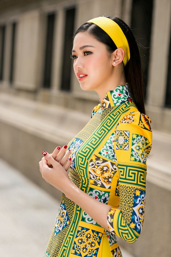 Á hậu Việt Nam 2016 - Thanh Tú - cũng tiếp tục lựa chọn tà áo dài với họa tiết, kiểu dáng giống Diễm Trang. Tuy nhiên, người đẹp lựa chọn gam màu vàng nổi bật, khiến cô nàng trở nên tươi tắn.