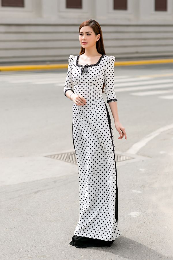 Chấm bi là một trong những họa tiết đặc trưng của thập niên 60. Trong năm 2018 này, họa tiết này cũng trở lại mạnh mẽ, Diễm Trang cũng lựa chọn một chiếc áo dài họa tiết chấm bi để trưng diện.